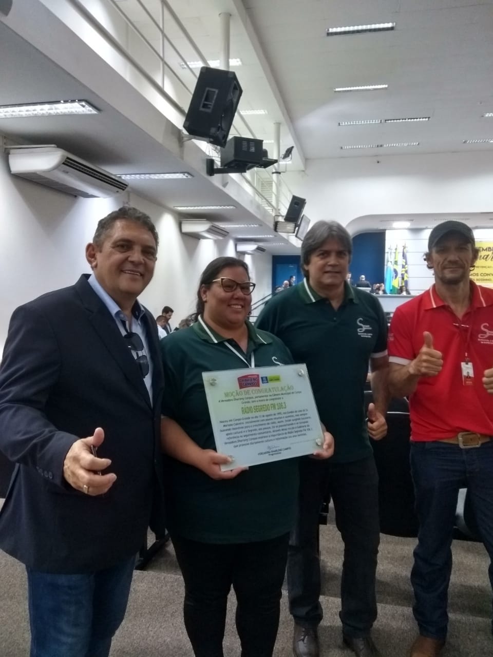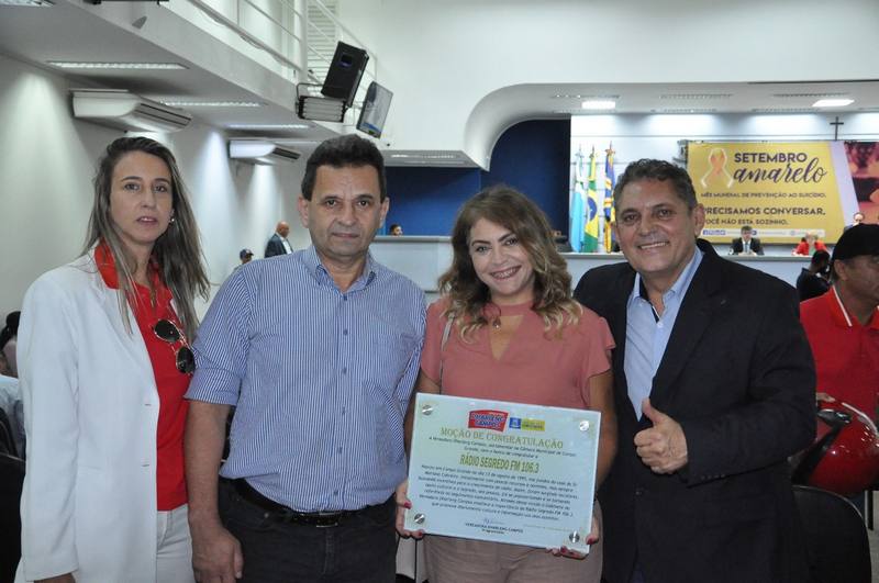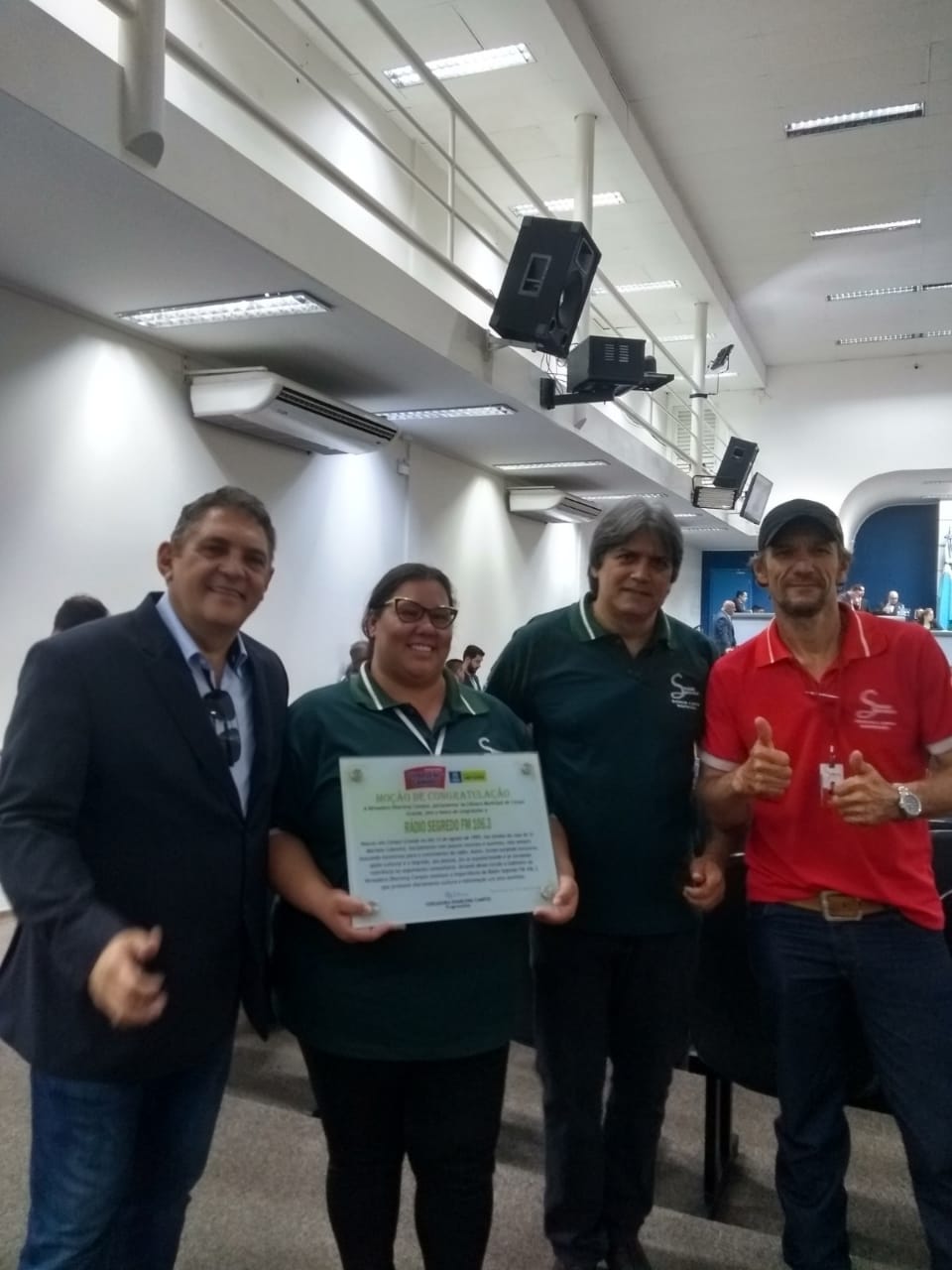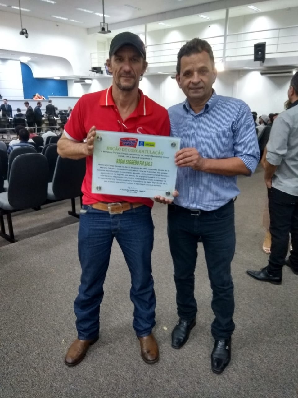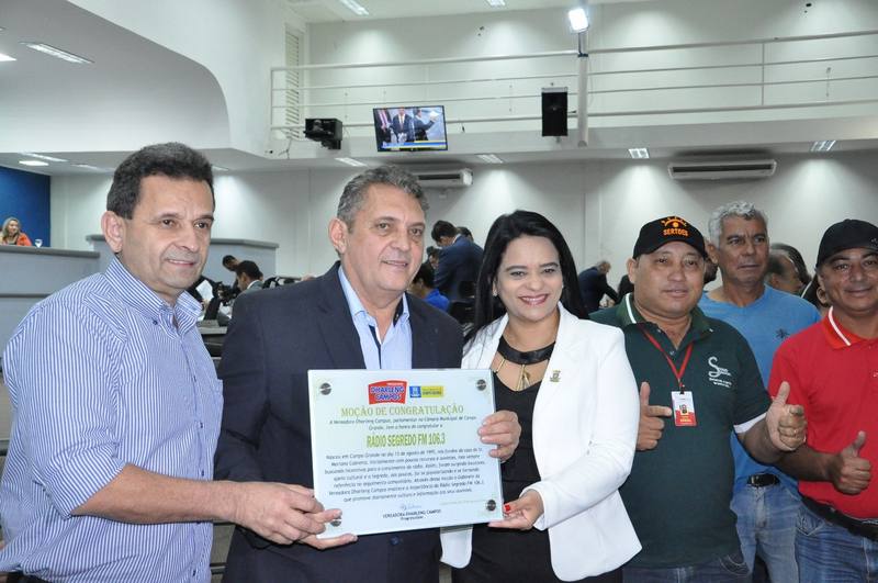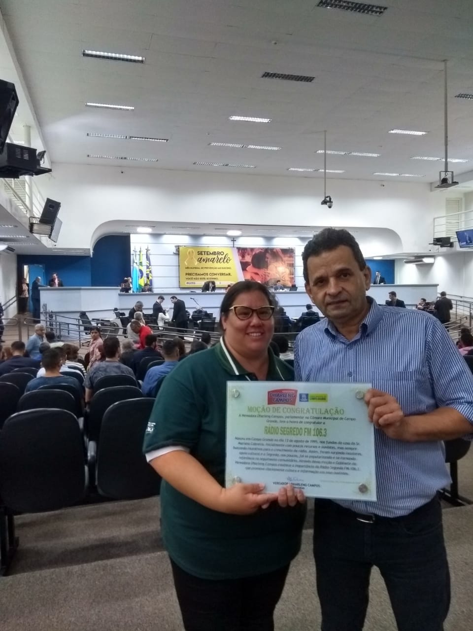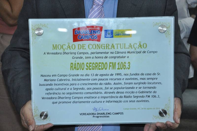 Inaugurada em 13 de agosto de 1993 pelo empresário Mariano Cabreira, a Rádio Segredo FM é exemplo de emissora de rádio alternativa que deu certo. Com 24 anos de funcionamento ininterrupto, a Segredo FM conquistou um lugar no coração do radiouvinte campo-grandense e não só lidera no segmento rádio comunitária como está à frente de algumas tradicionais rádios comerciais da Capital. Devido a importância que ganhou no cenário da comunicação radiofônica campo-grandense, na manhã da última quinta-feira, a Câmara Municipal de Campo Grande, por indicação da vereadora Dharlegn Campos (PP), realizou uma sessão em homenagem aos 24 anos da Rádio Segredo, outorgando-lhe uma placa em reconhecimento aos serviços prestados á comunicação nestas mais de duas décadas de existência. O radialista Eli Sousa, acompanhado do empresário e pesquisador Urandir Fernandes de Oliveira, do Centro Dakila Pesquisas, de amigos e de vários colaboradores da Segredo FM, foi quem recebeu das mãos da vereadora Dharleng Campos a placa homenageando a emissora de rádio. Na placa, a autora da proposição fez questão de inserir um pouco da história da Segredo FM relatando que a emissora nasceu no dia 13 de agosto de 1995 nos fundos da casa do senhor Mariano Cabreira. “Inicialmente com poucos recursos e ouvintes, mas sempre buscando incentivos para o crescimento da rádio” relata, acrescentando que “assim foram surgindo locutores, apoio cultural e a Segredo, aos poucos, foi se popularizando e se tornando referência no seguimento comunitário”. Dharleng ainda enfatiza na placa de homenagem que através da moção, o seu gabinete enaltece a importância da Rádio Segredo FM 106.3 MHz;, “que promove diariamente a cultura e a informação aos seus ouvintes”.